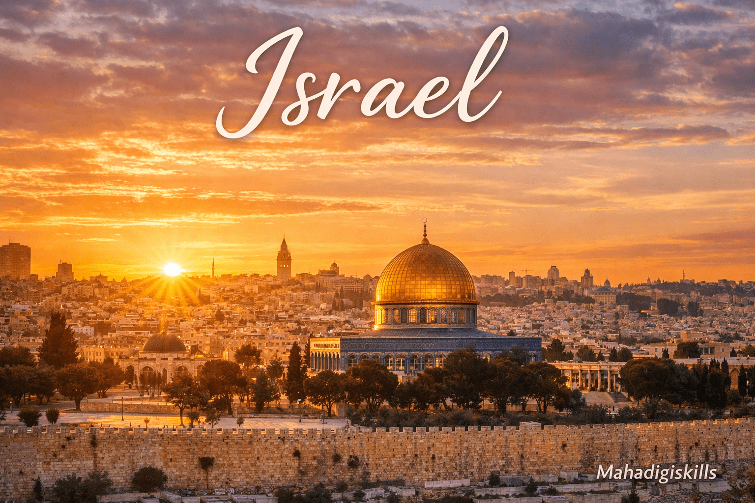 Jerusalem is the capital city and a center of religion, culture, and history. Major landmarks include the Western Wall, Dome of the Rock, and Church of the Holy Sepulchre.